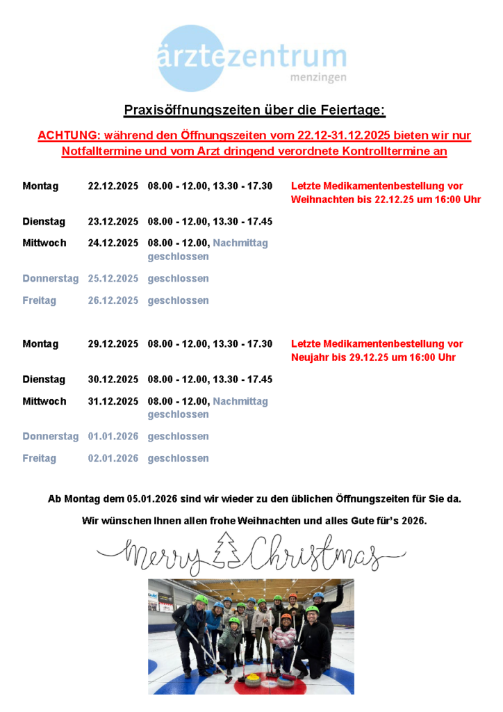 Bei Notfällen ausserhalb unserer Öffnungszeiten: Ärztlicher Notfalldienst 0900 008 008 und in bedrohlichen Situationen: 144